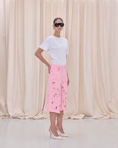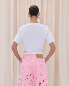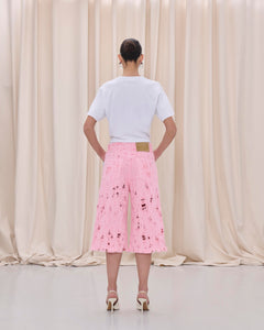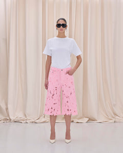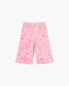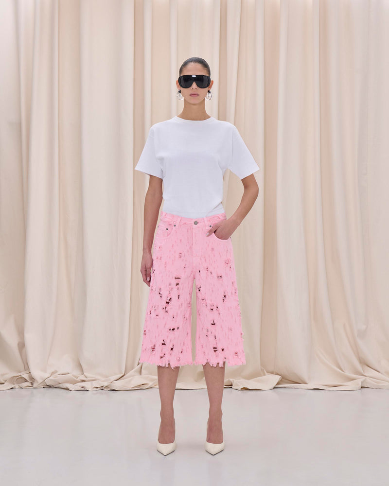 Bermuda shorts in bold flamingo pink with distressed detailing and a modern