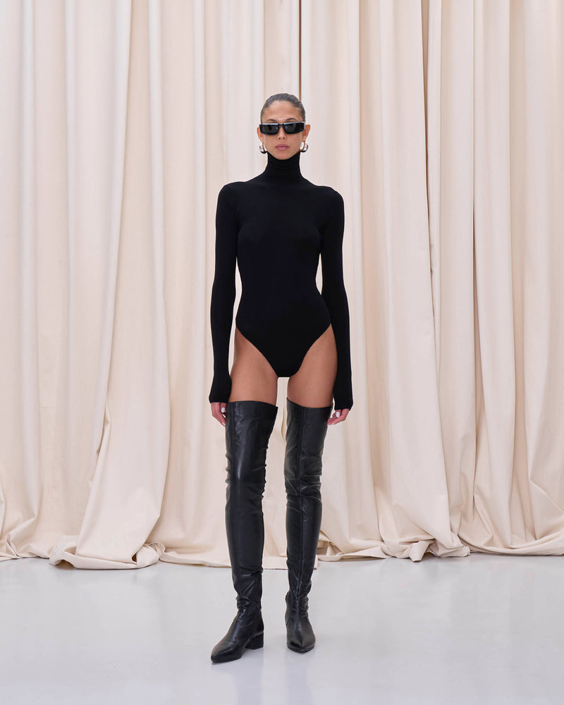 Soft wool bodysuit, fitted with classic turtleneck.