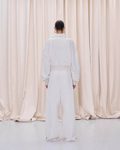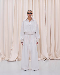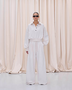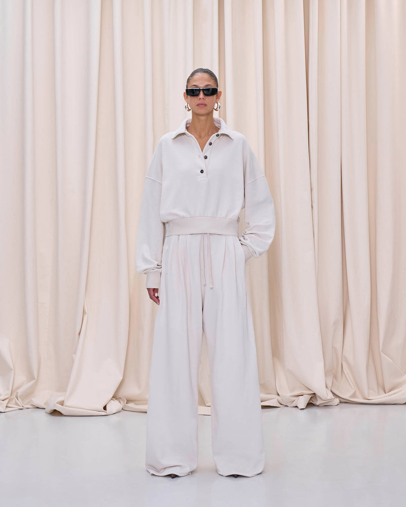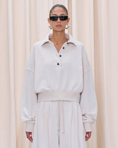 Cotton jersey polo sweatshirt with front buttoning, raglan long sleeves, back logo detail, fleece lining, ribbed hem and cuffs.