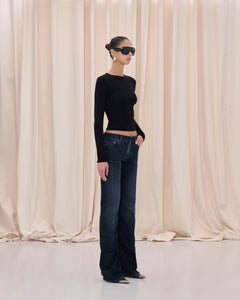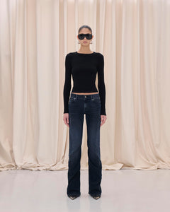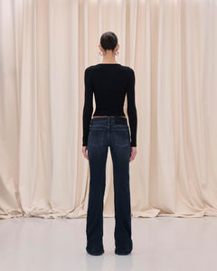 Low waist denim with slim silhouette and gentle flare at the hem