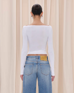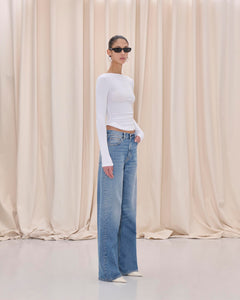 Mid-rise denim, slightly flared leg, relaxed fit.