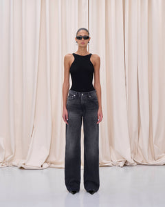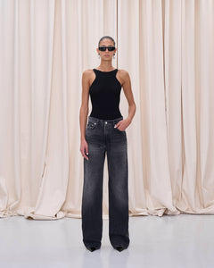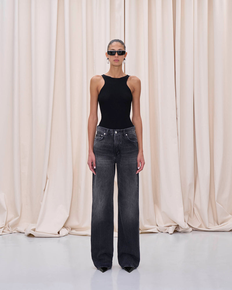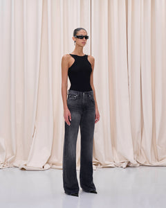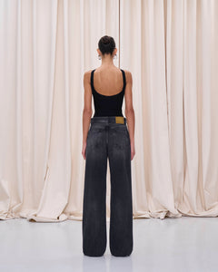 Mid-rise denim, slightly flared leg, relaxed fit.