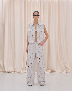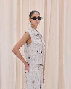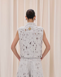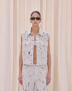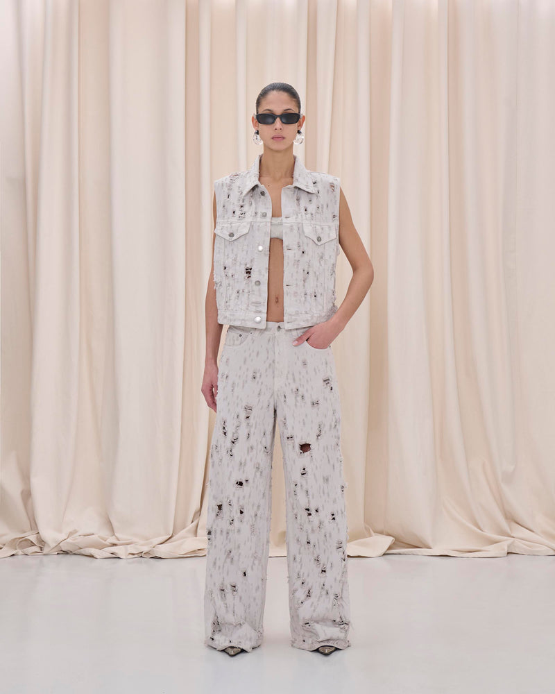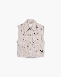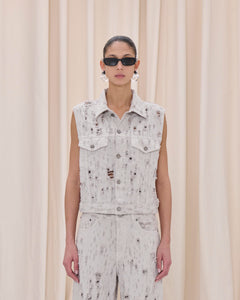 Denim gilet in cotton with distressed details, front button closure, and adjustable hem