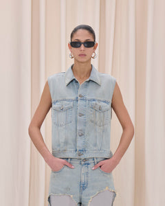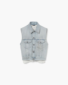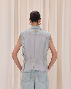Denim gilet in dusty blue cotton with distressed back detail, contrast satin insert, and adjustable back strap.