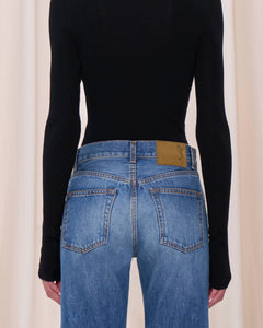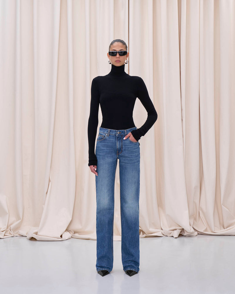 Mid-rise denim, straight leg, relaxed waist.