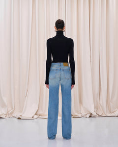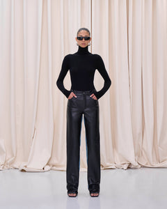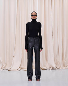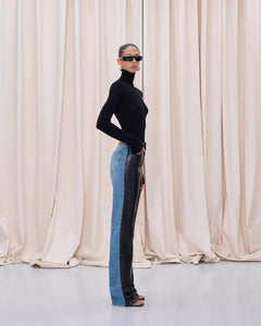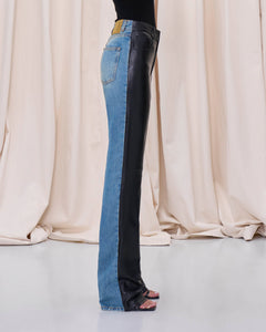 Mid-rise denim, straight leg, leather front, relaxed waist.