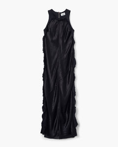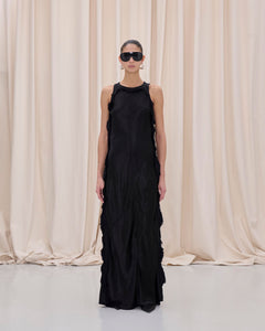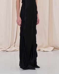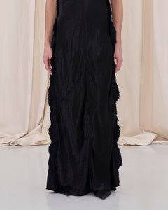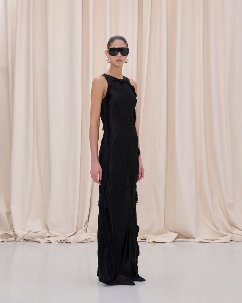 Maxi dress in satin with raw frayed edges and a fluid silhouette, finished with an