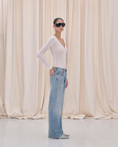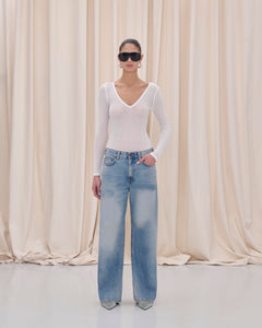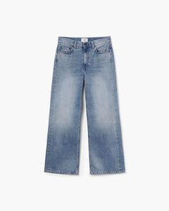 Denim jeans with mid-rise, wide-leg fit, five pockets, and suede logo patch at the back.